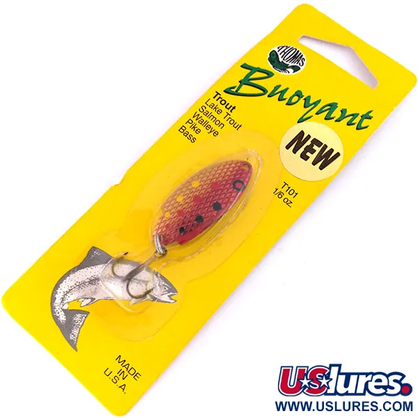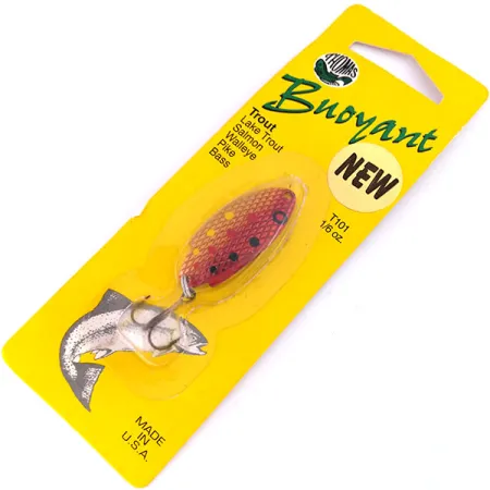 Tämä 5 g (3/16 oz) painoinen Thomas Buoyant -metallilusikka on väritykseltään Red Trout, jossa on teksturoitu suomukuvio kuparinvärisellä pohjalla, korostettuna selkeillä punaisilla, mustilla ja keltaisilla merkinnöillä. Tässä 4 cm (1 1/2") pituisessa Yhdysvalloissa valmistetussa uistimessa on tuotekoodi 10194, ja se on täydellinen esimerkki Thomas Buoyant -muotoilusta. Sen ainutlaatuinen, epäsymmetrinen rungon muoto on suunniteltu erityisesti heittokalastukseen ja vetouisteluun, joissa tarvitaan voimakasta sivuttaisliikettä. Tämä yksilö on käyttämätön alkuperäisessä keltaisessa läpipainopakkauksessaan, ja sen kuntoluokitus on 6. Pakkauksessa mainitaan sen tehokkuus eri lajeille, kuten valkosilmäkuha, hauki ja ahven, vaikka se onkin taimenkalastajien keskuudessa legendaarinen valinta. Varustukseen kuuluu yksi uistinrengas ja terävä kolmihaarakoukku, jotka molemmat ovat siistissä kunnossa, kuten hyvin säilyneeltä vintage-tuotteelta voi odottaa.