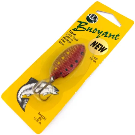 Eloisa kullan ja punaisen suomukuvio määrittää tämän lusikan rungon, jota korostavat selkeät keltaiset ja mustat pisteet sen kaarevalla pinnalla. Kooltaan 1 3/4" (4,5 cm) ja painoltaan 1/4 oz (7 g) oleva Thomas Buoyant on säilynyt käyttämättömänä alkuperäisessä keltaisessa pahvipakkauksessaan, jossa on tuotekoodi T102GR (tunnetaan myös numerolla 10250). Thomas Spinning Lures, Inc:n Hawleyssa, Pennsylvaniassa valmistama amerikkalainen klassikko on varustettu kestävällä kolmihaarakoukulla ja stansatulla metallirakenteella, joka soveltuu heittokalastukseen tai uisteluun. Pakkauksen etupuolella luetellaan eri kohdelajeja, kuten taimen, lohi ja valkosilmäkuha, ja kultainen 'NEW'-tarra korostaa sen keräilykuntoista vintage-tilaa. Kääntöpuolella olevat ohjeet kuvaavat jokikalastustekniikoita, kuten vieheen antamista 'vaappua' pohjan tuntumassa oikean syvyyden saavuttamiseksi. Tämä yksilö on säilyttänyt alkuperäisen viimeistelynsä ja osansa, koska sitä ei ole koskaan käytetty.