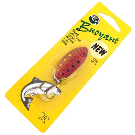 Kullattu messinki toimii pohjana tämän 7 g (1/4 oz) lusikkauistimen yksityiskohtaiselle Red Trout -viimeistelylle. Tämä käyttämätön yksilö alkuperäisessä keltataustaisessa läpipainopakkauksessaan edustaa Hawleyssa, Pennsylvaniassa toimivan Thomas Spinning Lures, Inc:n perinteisiä amerikkalaisia valmistusstandardeja. Kuviointi koostuu syvänpunaisesta suomukuvioinnista, jota täplittävät mustat ja keltaiset pilkut, jäljitellen pienen taimenen ulkonäköä. Tuotekoodilla 10282 merkitty pakkaus viittaa myös tuotenumeroon T102GR, mikä tarkoittaa kullan ja punaisen väriyhdistelmää. Kirkas hopeinen kolmihaarakoukku on kiinnitetty uistimen perään uistinrenkaalla, ja se on täysin tehdasasussaan. Kalastajat ovat käyttäneet Thomas Buoyant -uistimia vuosikymmenien ajan tavoitellessaan lajeja kuten lohta, kuhaa ja haukea erilaisissa joki- ja järviympäristöissä. Pakkauksen takapuolella olevat yksityiskohtaiset ohjeet suosittelevat heittämään hieman ylävirtaan tai suoraan virran poikki syvyyden hallitsemiseksi kelauksen aikana.