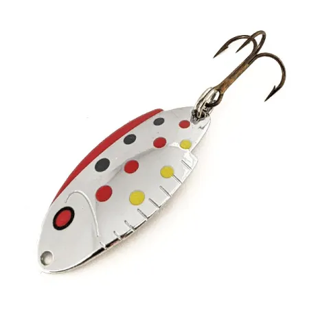Nikkelipinnoite toimii pohjana perinteiselle punaiselle, mustalle ja keltaiselle pistekuvioinnille tässä 4 cm (1 1/2") uistimessa. Tämä 5 gramman (3/16 oz) painoinen Thomas Buoyant (tuotekoodi 11248) on muodoltaan perinteinen lusikkauistin, joka on määritellyt amerikkalaista taimenen kalastusta sukupolvien ajan. Kääntöpuolella on selkeästi valmistajan nimi ja syvälle metalliin painettu 'BUOYANT'-leima. Voimakas punainen korostus seuraa ulkokaarta, ja etupuolella on tyylitelty silmä. Kolmihaarakoukku ja uistinrenkaat ovat kirkkaat ja terävät, vastaten 5/5-kuntoarviota. Tämä USA:ssa valmistettu yksilö on säilyttänyt korkeakiiltoisen loisteensa koko rungossaan, ja maalipinta on edelleen puhdas ja eläväinen.