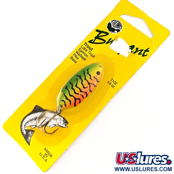 Tämä tunnistettavaan Fire Tiger -väriin puettu 7 gramman (1/4 oz) lusikkauistin edustaa klassista pikkukalamallia, joka on määritellyt Thomas Spinning Lures -tuotteita vuosikymmenten ajan. Tässä 4,5 cm:n (1 3/4") mallissa (tuotekoodi 11349) on korkeakontrastinen viimeistely, joka vaihtuu kirkkaan limenvihreästä selästä keltaiseen keskiosaan ja oranssiin vatsaan, mustien raitojen viimeistellessä kokonaisuuden. Keltainen taustakortti ja sen "Made in U.S.A." -leima korostavat uistimen alkuperää Hawleysta, Pennsylvaniasta. Käyttämättömänä ja alkuperäisessä pakkauksessaan oleva uistin on täydellisessä kunnossa, juuri sellaisena kuin se lähti tehtaalta. Pakkaus mainitsee sen soveltuvan taimenelle, lohelle ja kuhalle, mikä heijastaa tämän amerikkalaisen uistimen pitkää historiaa. Uistin on varustettu hopeanvärisellä kolmihaaralla ja uistinrenkaalla, ja se soveltuu sekä heittoon että uisteluun joissa ja järvissä.