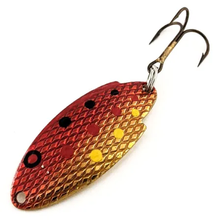 „Rainbow Hammered Red“ -viimeistelyn vasaroidut tekstuurit luovat moniulotteisen välkkeen, joka on määritellyt Thomas Buoyant -sarjaa vuosikymmenien ajan. Tämä 38 mm (1 1/2") pitkä, erottuvan kyhmyselkäinen yhdysvaltalainen lusikkauistin on taimenen- ja lohenkalastajien perusvaruste. Kiillotettuun kultaviimeistelyiseen taustaan on lyöty „THOMAS 1/6 oz BUOYANT“ -merkintä, vaikka tämä nimenomainen yksilö on luetteloitu 5,3 gramman (3/16 oz) painoiseksi tuotekoodilla 11696. Yläpinnassa on täyteläinen punainen liukuväri, joka vaihtuu kullaksi, ja se on koristeltu mustilla, punaisilla ja keltaisilla pisteillä. Koukutus on erinomaisessa kunnossa, ja siinä on vahva kolmihaarakoukku kiinnitettynä tukevalla uistinrenkaalla. Kunnoltaan 5/5 oleva uistin on säilyttänyt alkuperäisen hohdon ja selkeät yksityiskohdat.