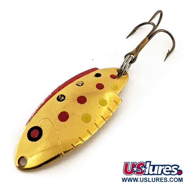 Kultataimenen kuviointi luonnehtii tätä klassista amerikkalaista lusikkauistinta, jossa on kirkas kullattu viimeistely punaisilla, keltaisilla ja mustilla täplillä. Painoltaan 3/16 oz (5 g) ja pituudeltaan 1 1/2" (4 cm) oleva Thomas Buoyant on olennainen osa yhdysvaltalaista kalastusvälinehistoriaa. Kupera puoli on viimeistelty maalatulla punaisella reunalla ja pienillä syvennyksillä, jotka muistuttavat kalan eviä, mikä lisää sen viehätysvoimaa keräilijöiden ja kalastajien silmissä. Kääntöpuolelle metalliin on leimattu Thomas-merkin nimi ja mallimerkintä T101. Tämä tuotekoodilla 11974 tunnistettu yksilö on kunnoltaan 5/5, ja kullattu pinta sekä maalatut yksityiskohdat ovat säilyneet poikkeuksellisen hyvin. Heittoon tai uisteluun suunniteltu lusikka on varustettu terävällä kolmihaarakoukulla, joka on kiinnitetty tukevan uistinrenkaan avulla.