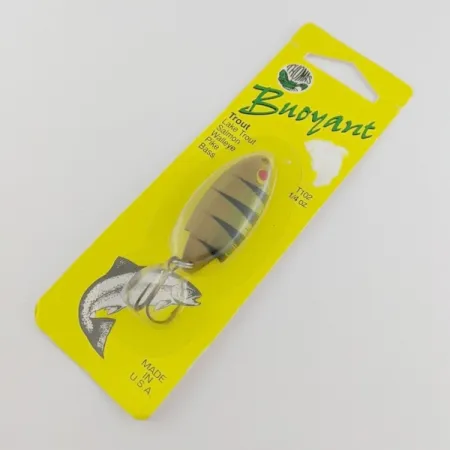 Ahven-kuviointi, jossa on selkeät mustat pystyraidat ja näyttävä punainen silmäyksityiskohta, saa tämän yksilön erottumaan edukseen vintage-keltaisessa alkuperäispakkauksessaan. Tämä 7 gramman (1/4 oz) painoinen ja 4,5 cm (1 3/4") pituinen yhdysvaltalaisvalmisteinen lusikkauistin kantaa tuotekoodia 24095 ja on edelleen taimenen, lohen ja hauen kalastajien luottoväline. Uistimen muotoilu on suora perillinen alkuperäiselle vuoden 1946 patentille, ja sen korkealaatuinen viimeistely on suunniteltu jäljittelemään pakenevan täkykalan ulkonäköä. Alkuperäispakkauksessa oleva uistin on käyttämätön ja säilyttänyt tehtaanraikkaan ulkoasunsa kirkkaine metalliosineen ja selkeine maalipintoineen. Historiallisesti Thomas suositteli hidasta kelausta tai uistelunopeutta varmistaakseen, että viehe jäljittelee tehokkaasti saaliin liikkeitä. Myyntipakkauksessa on klassinen Thomas Buoyant -brändäys, ja se korostaa uistimen monipuolisuutta eri lajeille kuhasta ahveneen.
