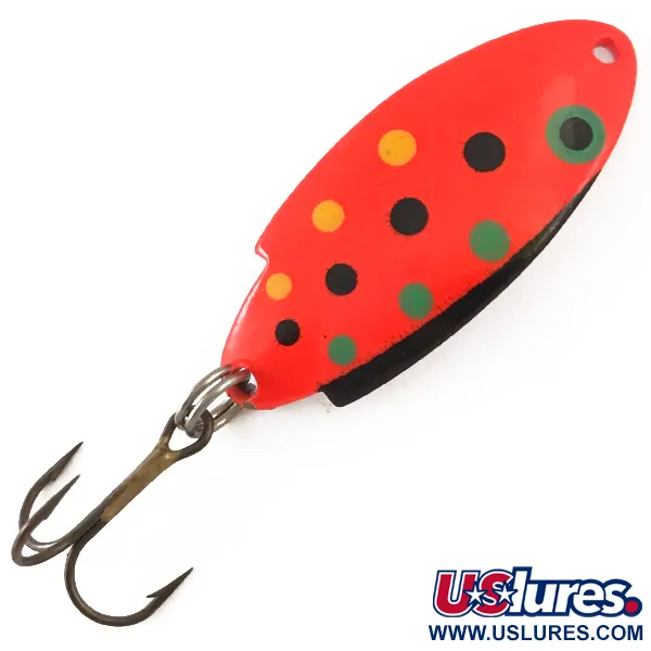Valkoiseen helmiäispuoleen suoraan metalliin lyödyt merkinnät tunnistavat tämän 3/16 oz (5 g) yksilön aidoksi Yhdysvalloissa valmistetuksi Thomas Buoyant -uistimeksi. Pituudeltaan 1 1/2" (4 cm) lusikkauistimen kuperalla puolella on ikoninen Red Trout -kuviointi, joka koostuu keltaisista, mustista ja vihreistä pisteistä tasaisen punaisella pohjalla. Tämä nimenomainen viehe, tuotekoodiltaan 4767, on säilynyt 5/5-kunnossa, ja siinä on puhdas viimeistely sekä punaisella etupuolella että helmiäisvalkoisessa takapuolella. Thomas valitsi tälle mallille klassisen pisaraprofiilin, johon on tässä yhdistetty pronssiviimeistelty kolmihaarakoukku ja kestävä uistinrengas. Tällaisia lusikoita käytetään perinteisesti heittokalastukseen virtavesissä tai uisteluun järvillä, joissa 5 g paino antaa riittävästi massaa tarkkoihin heittoihin ja syvyyden hallintaan.
