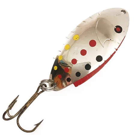 Nikkelipinnoite antaa kirkkaan, heijastavan pohjan tälle Yhdysvalloissa valmistetulle lusikkauistimelle, jota koristaa sarja punaisia, keltaisia ja mustia pisteitä. Kääntöpuolelle on selkeästi meistetty merkinnät 'T104', 'THOMAS BUOYANT' ja painomerkintä '1/2 OZ'. Tämä yksilö, luetteloitu tuotekoodilla 4769, on pituudeltaan 6 cm (2 1/4") ja painoltaan 14 g (1/2 oz). Rungon muotoiluun kuuluu hienovarainen kohokuvioitu kiduskansi lähellä kiinnityslenkkiä ja kirkkaanpunainen tehoste alareunassa. Uistin on varustettu vintage-tyylisellä pronssisella kolmihaarakoukulla, joka on kiinnitetty uistinrenkaalla. Tämä uistin on käyttämätön ja 5/5-kunnossa, ja siinä on alkuperäinen tehdaspinta ilman kulumia. Käytetään pääasiassa heitto- ja vetouisteluun, ja sen vankka metallirakenne on suunniteltu saavuttamaan haluttu syvyys tehokkaasti.