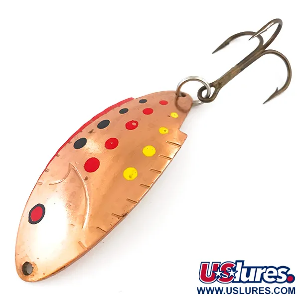 Kaarevan metallirungon kääntöpuolelle selvästi leimattu 'THOMAS BUOYANT' -merkintä ja 'PAT PEND' -tunniste osoittavat tämän 6 cm:n lusikkauistimen olevan osa amerikkalaista kalastushistoriaa. Lämmintä kuparipohjaa koristaa sarja eloisia punaisia, mustia ja keltaisia pilkkuja – klassinen värikuvio, joka on suunniteltu näkymään hyvin erilaisissa olosuhteissa. Tässä 14 g painavassa lusikassa on paksu runko ja erottuvat lovet toisessa reunassa, jotka jäljittelevät selkäevän siluettia. Varustukseen kuuluu tukeva uistinrengas ja pronssattu kolmihaarakoukku, jotka molemmat ovat rakenteellisesti kunnossa. Kuntoarvion ollessa 5/5 uistimen etupuoli on kaunis ja maalipinta terävä, kun taas takapuolella on muutamia kevyitä pintajälkiä ja pieniä ikääntymisen merkkejä, jotka todistavat sen vintage-arvon. Tämä Yhdysvalloissa valmistettu yksilö edustaa Thomas-merkille tyypillisiä kestäviä valmistusstandardeja.