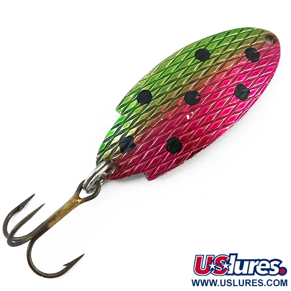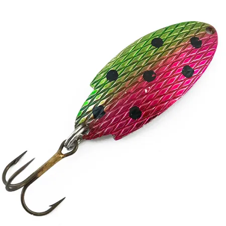 Kiillotetun nikkelitaustan stanssaus osoittaa tämän yksilön selvästi Thomas Buoyant T101 -malliksi, joka on klassinen yhdysvaltalainen malli. Tämän 4 cm (1 1/2") pituisen ja 5 g (3/16 oz) painoisen lusikkauistimen pinnassa on selkeä vinoneliökuviointi, joka luo realistisen suomuefektin. Tämä tuotekoodilla 5006 tunnistettava yksilö on väritykseltään Rainbow Trout, jolle on ominaista vihreästä vaaleanpunaiseen vaihtuva liukuväri ja selkeät mustat täplät. Varustukseen kuuluu kestävä uistinrengas ja terävä kolmihaarakoukku, ja uistin on 5/5-kunnossa. Kalastajat käyttävät tätä painoluokkaa tyypillisesti kevyeen heittokalastukseen puroilla tai järvillä tavoitellessaan taimenta ja ahvenkaloja. Metallirungon kovera profiili on suunniteltu syrjäyttämään vettä tehokkaasti tasaisessa kelauksessa. Jokainen yksityiskohta eloisasta maalipinnasta takapuolen selkeään kaiverrukseen heijastaa Thomas Spinning Lure Companyn korkeita laatustandardeja.