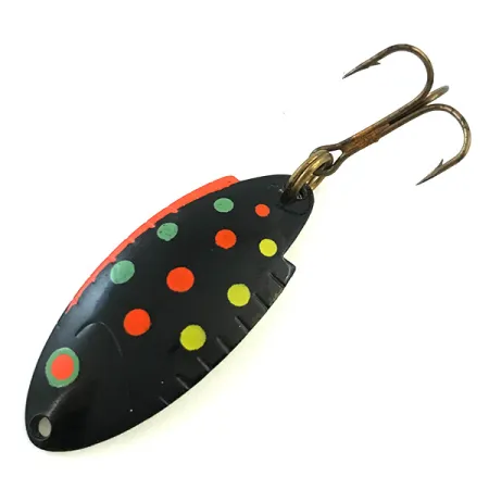 Tämä näyttävästi "Black Trout" -kuvioinnilla maalattu lusikkauistin on varustettu selkeillä vihreillä, oransseilla ja keltaisilla pilkuilla tummalla pohjalla. Pituudeltaan 4 cm (1 1/2") ja painoltaan 5 g (3/16 oz) oleva yksilö (tuotekoodi 5392) on erinomaisessa kunnossa (luokitus 5/5). Uistimen kääntöpuoli on kirkkaan keltainen, ja siihen on meistetty selkeästi tunniste "THOMAS T-101 BUOYANT". Alkuperäinen pronssiviimeistelty kolmihaarakoukku on kiinnitetty tukevasti uistinrenkaalla peräpäähän. Tämä USA:ssa valmistettu klassinen malli sisältää tunnusomaiset lovetut reunat, jotka antavat sille ainutlaatuisen uintilistan heitto- tai vetouisteluun makeassa vedessä. Keulassa on valmis silmukka siiman tai leikarin helppoa kiinnitystä varten.