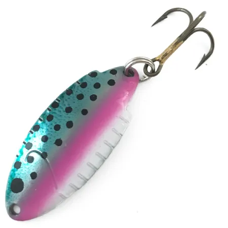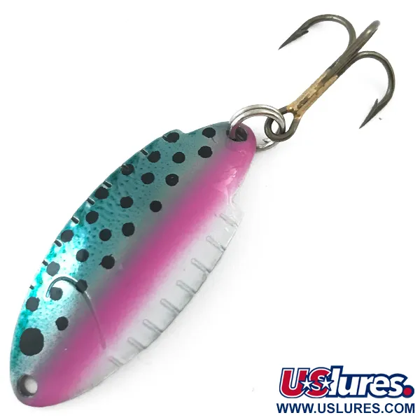 Tämän 1 1/2" (4 cm) lusikkauistimen kiillotettuun nikkelitaustaan on leimattu selkeästi painomerkintä 3/16 oz (5 g). Tässä Thomas Buoyant -mallissa (tuotekoodi 5544) on klassinen Taimen / Nikkeli -väritys, jossa on metallinhohtoinen sinivihreä yläosa ja syvän vaaleanpunainen kylkiviiva mustilla pilkuilla. Meistetyssä metallirungossa on tunnusomaiset lovet sivuilla, mikä on brändin Yhdysvalloissa tapahtuvan valmistushistorian tunnusmerkki. Terävä, pronssinen kolmihaarainen koukku on kiinnitetty hopeisella uistinrenkaalla perään. Kuntoarvion ollessa 5/5, uistimen viimeistely on säilynyt uskomattoman hyvin, ja meistetty teksti "THOMAS 3/16 OZ BUOYANT" on edelleen selkeä ja luettavissa heijastavaa nikkelipintaa vasten.