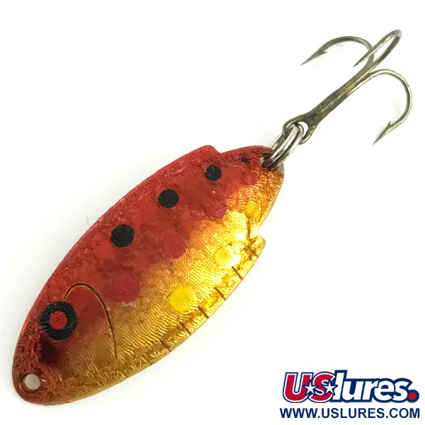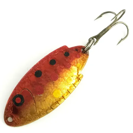 Kultaiset sävyt yhdistettynä kirkkaanpunaiseen taimenkuvioon määrittelevät tämän vintage-tyylisen Thomas Buoyant -lusikkauistimen estetiikan. Tuotekoodilla 5820 varustettu uistin on pituudeltaan tarkalleen 1 1/2" (4 cm) ja painoltaan 3/16 oz (5 g). Viimeistelynä on yksityiskohtainen Golden Rainbow Red Trout, jossa on voimakkaan punainen yläosa mustilla pisteillä ja teksturoitu kultainen alaosa keltaisilla pilkuilla. Varusteet ovat erittäin siistit, sisältäen alkuperäisen kolmihaarakoukun ja uistinrenkaan. Messinginväriseen kääntöpuoleen on stanssattu syvälle 'THOMAS', 'T101', 'BUOYANT' ja '1/6 oz' -painomerkintä, mikä on yleinen variaatio näissä käsin lyödyissä vintage-yksilöissä. Kunto on erinomainen 5/5, maali on säilynyt hyvin ja teksti on selkeää. Thomas Spinning Lure Co:n Yhdysvalloissa valmistamassa rungossa on hienovarainen metalliin syövytetty suomukuvio, joka parantaa näkyvyyttä vedessä. Pieni punakeskinen silmäyksityiskohta sijaitsee lähellä siiman kiinnityspistettä täydentäen tämän klassikon ulkonäön.