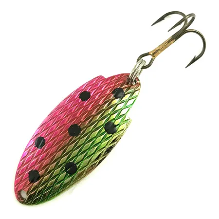 Hopeiseen kääntöpuoleen selvästi leimattu mallimerkintä T101 tunnistaa tämän Thomas Buoyant -uistimen klassiseksi osaksi amerikkalaista kalastushistoriaa. Painoltaan 3/16 unssia (5 g) ja pituudeltaan 1 1/2 tuumaa (4 cm) oleva yksilö on varustettu erottuvalla Hammered Rainbow Trout -kuviolla. Etupuolen väripaletti vaihtuu syvästä magentanpunaisesta kirkkaaseen limenvihreään, ja sitä korostaa kuusi selkeää mustaa täplää vinoneliön muotoisissa pinnoissa. Uistimen taustapuoli on viimeistelty puhtaalla hopealla, ja siinä on kohokuvioitu Thomas-tuotemerkki ja painomerkintä. Pronssinvärinen kolmihaarakoukku on kiinnitetty runkoon tukevalla hopeisella uistinrenkaalla. Tämä nimenomainen uistin, tuotekoodiltaan 5823, on kunnoltaan 5/5, ja sen kaikilla pinnoilla on kirkas metallinen kiilto. Sen ainutlaatuinen epäsymmetrinen muoto on tyypillinen tälle USA:ssa valmistetulle sarjalle, joka on suunniteltu kevyeen heittokalastukseen.