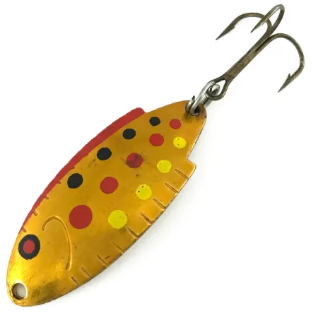 Kultasävyinen messinki muodostaa rungon tälle 7 gramman lusikkauistimelle, jossa on Thomas Spinning Lure Companyn klassikkomalleille tyypillinen lovettu pyrstö. Tämän 4,5 cm uistimen Golden Trout -viimeistely on erittäin siisti, ja siinä on kirkkaita mustia, punaisia ja keltaisia pisteitä maalattuna kultaiselle metallipinnalle jäljittelemään tammukan ulkonäköä. Koveralle puolelle on selkeästi meistetty mallimerkintä T102, mikä kertoo sen yhdysvaltalaisesta alkuperästä ja Thomas Buoyant -nimeen liittyvistä valmistusstandardeista. Tuotekoodilla 7195 varustettu yksilö on 5/5-kunnossa, säilyttäen alkuperäisen korkeakiiltonsa ja tarkan maalipinnan, mukaan lukien hienovarainen kohokuvioitu kidusviiva siimalenkin lähellä. Tukeva uistinrengas yhdistää alkuperäisen pronssatun kolmihaarakoukun takaosaan, varmistaen että varusteet ovat yhtä kestäviä kuin tehtaalta lähtiessään.