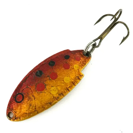 Kuperan puolen vasaroitu kultapinta toimii pohjana tämän 4 cm (1 1/2") lusikkauistimen Red Trout -väritykselle. Viimeistely vaihtuu lämpimäksi punertavan-oranssiksi liukuväriksi yläreunassa, ja sitä täplittävät käsinmaalatut mustat, punaiset ja keltaiset pisteet. Tuotekoodilla 7225 tunnistettu uistin painaa 5 g (3/16 oz), ja siinä on sileä kullanvärinen kääntöpuoli selkeillä kaiverruksilla. Kaiverruksiin kuuluvat "THOMAS"-nimi, "T101"-mallinumero ja "BUOYANT"-tuotemerkki, jotka on sijoitettu tyyliteltyyn kalan hahmoon, jonka reunoilla on suomukuviointi. Vaikka metalliin on leimattu 1/6 oz, rakenne on tyypillinen tälle paksulle amerikkalaisvalmisteiselle sarjalle. Tukeva pronssinen kolmihaarakoukku on kiinnitetty uistinrenkaalla perään, ja keulassa on siisti silmukka siiman kiinnitystä varten. Tämä yksilö on 5/5-kunnossa, eikä maalipinnassa tai metallipinnoitteessa ole kulumia tai kiillon himmenemistä.