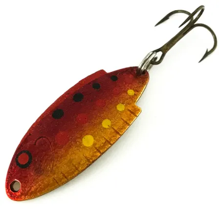 Messinginsävyiseen kääntöpuoleen selvästi leimattu T102-merkintä tunnistaa tämän 1/4 oz (7 g) yksilön klassiseksi yhdysvaltalaiseksi lusikkauistimeksi. Red Trout -väritys, joka vastaa tuotekoodia 7227, sisältää syvän purppuranpunaisen selän, joka vaihtuu loistavaan kullanoranssiin vatsaan, ja on viimeistelty käsinmaalatuilla mustilla ja keltaisilla pilkuilla. Uistimen 4,5 cm runkoa luonnehtivat alareunassa olevat selkeät suomumaiset lovet, jotka on suunniteltu heijastamaan valoa useista eri kulmista. Tämä yksilö on 5/5-kunnossa, ja siinä on eloisa maalipinta sekä puhdas, alkuperäinen pronssiviimeistelty kolmihaarakoukku kiinnitettynä vankalla uistinrenkaalla. Takapuolella syvään kaiverretut THOMAS BUOYANT- ja valmistajamerkinnät ovat säilyneet terävinä ja helppolukuisina.