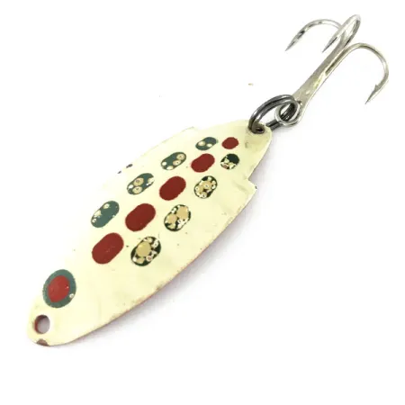 Tämän 4,5 cm (1 3/4 tuumaa) pitkän Thomas Buoyant -uistimen stansatussa metallirungossa on klassinen „kyttyräselkäinen“ profiili, joka on tehnyt siitä taimenpakkien vakiovarusteen sukupolvien ajan. Etupuolella on Valkoinen / Punainen väritys, jossa kermanvärinen pohja on koristeltu punaisilla, tummanvihreillä ja kultaisilla pilkuilla. Uistimen kääntöpuoli on kokonaan punainen, mikä tarjoaa voimakkaan visuaalisen kontrastin alhaalta seuraaville kaloille. Arvosanalla 4/5 varustettu viimeistely on erittäin siisti, ja siinä on vain vähäisiä ikääntymisen merkkejä. 7 gramman (1/4 oz) painoisena se on ihanteellinen tarkkuusheittoihin syönnösvirtoihin. Tämä Yhdysvalloissa valmistettu yksilö, tuotekoodiltaan 9509, on varustettu alkuperäisellä kolmihaaralla ja uistinrenkaalla.