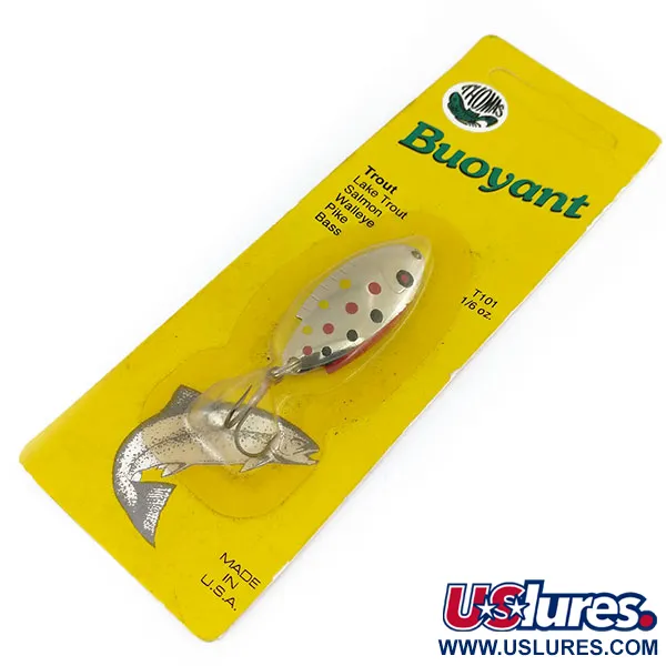 Kiillotettu nikkelipinnoite toimii pohjana punaisille ja keltaisille pisteille tässä klassisessa Thomas Buoyant -lusikkauistimessa. Tuotekoodilla 9675 tunnistettu yksilö painaa 3/16 oz (5 g) ja on pituudeltaan kompakti 1 1/2" (4 cm). Se on käyttämätön alkuperäisessä keltaisessa pahvipakkauksessaan, mikä on säilyttänyt pinnoitteen ja koukut 6/5-kunnossa. USA:ssa valmistetussa uistimessa on epäsymmetrinen muoto, joka on suunniteltu erityisesti heittokalastukseen tai uisteluun makeassa vedessä lajeille kuten taimen, lohi ja ahven. Pakkaus korostaa sen toimivuutta kuhalle, hauelle ja harmaanieriälle, ja lusikan takaosassa on kolmihaarakoukkuun kiinnitetty kirkkaanpunainen houkutuslevy. Tämä perinteinen väriyhdistelmä on suunniteltu maksimoimaan näkyvyys eri vesiolosuhteissa, heijastaen Thomas-merkin pitkäaikaisia tuotantostandardeja.