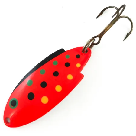 Hopeoidulle koveralle puolelle on selkeästi meistetty klassinen "THOMAS BUOYANT MADE IN USA" -merkintä, joka vahvistaa tämän uistimen amerikkalaisen alkuperän. Tällä 1 3/4" (4,5 cm) profiililla varustetulla mallilla on painoa monipuoliset 1/4 unssia (7 g), mikä tekee siitä vankan vaihtoehdon kevyillä välineillä kalastamiseen. Viimeistelynä on eloisa Red Trout UV Glow -kuvio, jossa on rohkea fluoresoiva oranssinpunainen pohja ja vihreitä, mustia sekä keltaisia pilkkuja. Tuotekoodilla 5393 varustetussa lusikassa on käytetty UV-valoon reagoivaa erikoismaalia, joka parantaa näkyvyyttä hämärässä. Varustukseen kuuluu alkuperäinen pronssinsävyinen kolmihaarakoukku, joka on kiinnitetty uistimen leveään takaosaan uistinrenkaalla. Kuntoarvio on 5/5, ja metallirungossa on tasainen, kiiltävä pinta.