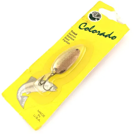Kullan ja nikkelin sävyt hallitsevat tämän 5g (3/16oz) lusikkauistimen pintaa, jossa on metalliin meistetty selkeä suomukuvio. Pituudeltaan 3,2cm (1 1/4") oleva Thomas Colorado -malli (Tuotekoodi: 11695) heijastaa amerikkalaisen käsityötaidon selkeää ja toimivaa linjaa. Uistimen pintaan on selvästi meistetty nimi 'COLORADO', ja se on perinteisesti suunniteltu heittokalastukseen tai uisteluun tavoiteltaessa taimenia, lohia ja kuha-lajeja. Tämä yksilö on käyttämätön ja säilynyt alkuperäisessä keltaisessa kuplapakkauksessaan, jossa näkyy perinteinen Thomas-logo. Varustukseen kuuluu tukeva kolmihaarakoukku kiinnitettynä uistinrenkaalla, mikä osoittaa tehtaan siistiä kokoonpanotyötä. Hyppäävän taimenen kuva ja 'MADE IN U.S.A.' -painatus kartongissa lisäävät tämän vuosisadan puolivälin löydön historiallista tunnelmaa.