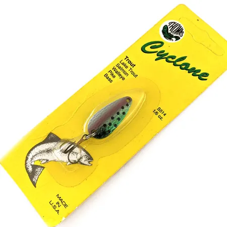 USA:ssa käsin meistetty Thomas Cyclone painaa 1/8 oz (4,3 g) ja on pituudeltaan 1 1/2" (4 cm). Rainbow Trout -värityksessä on perinteinen pistekuvio vihreästä vaaleanpunaiseen vaihtuvalla pohjalla, mikä jäljittelee lohen ja järvitaimenen ravintoa. Tuotekoodilla 11694 tunnistettava uistin on käyttämätön ja sinetöity alkuperäiseen keltaiseen pahvipakkaukseensa. Varustuksena on yksi pronssinvärinen kolmihaarakoukku, joka on kiinnitetty tukevalla uistinrenkaalla. Thomas Spinning Lures -uistimet tunnetaan laadustaan, ja tämä yksilö edustaa puhtaimmillaan yhtiön amerikkalaista valmistusperinnettä.
