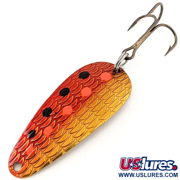 Selvästi kullattuun takapuoleen stansattu "THOMAS S515 1/4 OZ CYCLONE" -merkintä tunnistaa tämän klassisen amerikkalaisen lusikan. Vieheen pituus on 4,5 cm (1 3/4") ja paino 7 g (1/4 oz), ja sen kuperalla puolella on erottuva kohokuvioitu suomukuvio. Tässä teksturoidussa pinnassa on eloisa oranssi-kulta liukuväri, jota korostavat käsin levitetyt punaiset ja mustat täplät. Kääntöpuoli on erittäin heijastavaa kiillotettua kultaa, mikä tarjoaa hyvän näkyvyyden ja kontrastin heitto- tai uistelukäytössä. Valmistettu Yhdysvalloissa tuotekoodilla 12881, tämä yksilö on 5/5-kunnossa ja viimeistely on virheetön. Kolmihaarakoukku on kiinnitetty tukevalla uistinrenkaalla, ja kärki on porattu suoraa siimaa tai lukkoa varten.