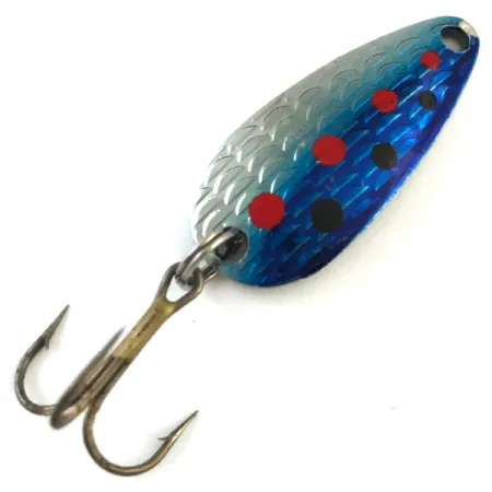 Tämä 1/8 oz (4,3 g) painoinen Thomas Cyclone on viimeistelty perinteisellä Blue Trout -kuviolla, jossa on teksturoitu hopeinen suomupinta, joka vaihtuu syvännsiniseen osioon punaisilla ja mustilla täplillä. Lusikan kääntöpuolelle on selkeästi leimattu valmistajan nimi, malli SS14 ja paino, mikä kertoo sen alkuperästä USA:sta. Tässä tuotekoodilla 5188 tunnistetussa yksilössä on terävä kolmihaarakoukku ja alkuperäinen uistinrengas, ja se on erinomaisessa 5/5-kunnossa. Pituudeltaan 1 1/4" (3 cm) uistin on hieno esimerkki klassisesta lusikkauistimen muotoilusta. Metallirunko on säilyttänyt alkuperäisen kiiltonsa korostaen Cyclone-sarjalle ominaisia kohokuvioituja suomuyksityiskohtia.