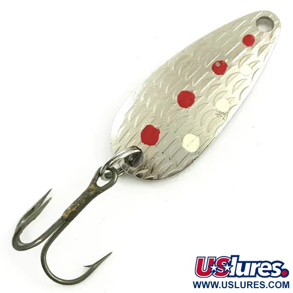 Lusikan takapuolelle on leimattu valmistajan nimi ja mallimerkintä, mikä vahvistaa sen alkuperän olevan Yhdysvalloista. Thomas Cyclone on 3 cm (1 1/4") pitkä, painaa 4,3 g (1/8 oz) ja siinä on klassinen pisaranmuotoinen profiili. Hopeanväriseen etuosaan on pakotettu syvä suomukuvio ja se on koristeltu selkeillä punaisilla ja valkoisilla pisteillä. Tuotekoodilla 5818 tunnistettava yksilö on varustettu yhdellä metallisella kolmihaarakoukulla. 5/5-kuntosuosituksen ansiosta lusikassa on puhdas, heijastava pinta ja tarkat maalatut yksityiskohdat teksturoidussa rungossa.