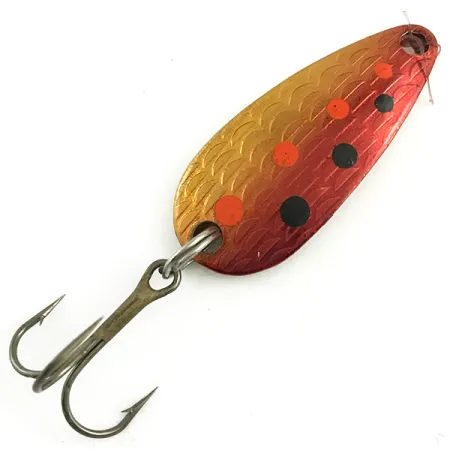 Kuperan puolen kohokuvioitu suomutekstuuri antaa tälle 3 cm (1 1/4") lusikkauistimelle erottuvan pinnan. Rainbow Red Trout / Gold -värityksessä on kultainen pohja, joka vaihtuu kirkkaan punaiseen, viimeisteltynä oransseilla ja mustilla täplillä. Tämä Thomas Cyclone (tuotekoodi 5819) on valmistettu messinkiaihiosta, jonka kääntöpuolelle on stanssattu valmistajan nimi, "S514" sekä "1/6 oz" -merkintä, vaikka virallinen paino on 1/8 oz (4,3 g). Yhdysvalloissa valmistettu uistin on varustettu kestävällä kolmihaarakoukulla ja vahvalla uistinrenkaalla. Kuntoarvio on 5/5; uistin on tehdaspuhtas ilman käytön jälkiä tai hapettumia. Päädyssä oleva kiinnityspiste mahdollistaa suoran solmun tai lukon käytön, mikä on tyypillistä tarkkuusheittoon tarkoitetuille uistimille.