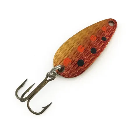 Tämän lusikkauistimen etupinta on varustettu syvällä suomukuviolla ja eloisalla Red Trout -viimeistelyllä, joka vaihtuu kirkkaasta kullasta lämpimään kuparinpunaiseen. Dokumentaation mukaan 1 1/4" (3 cm) pitkä ja 1/8 oz (4,3 g) painava Thomas Cyclone on klassinen amerikkalainen uistin, joka on luetteloitu tuotekoodilla 8306. Kääntöpuolella on selkeä alkuperäinen leima, josta ilmenee valmistaja ja mallimerkintä S514, vaikka metalliin on kaiverrettu painoksi 1/6 oz. Kuusi käsinmaalattua pistettä — kolme oranssia ja kolme mustaa — luovat tälle väritykselle ominaisen visuaalisen kontrastin. Uistin toimitetaan alkuperäisillä varusteilla, mukaan lukien tukeva uistinrengas ja terävä kolmihaarakoukku, ja se on 5/5-kunnossa. Metallityön tarkkuus on tyypillistä yhdysvaltalaisen Thomas-yhtiön laadunvalvonnalle.
