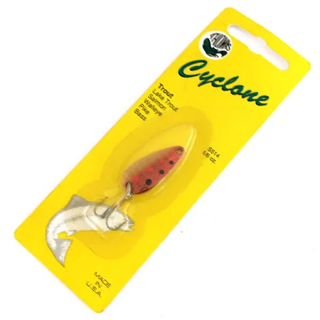 Tämän mallin Red Trout -kuvioinnissa on voimakas punainen pohja, jossa on selkeitä mustia täpliä – klassinen valinta pienten syöttikalojen jäljittelyyn. Painoltaan 1/8 unssia (4,3 g) ja pituudeltaan 1 1/4 tuumaa (3,2 cm) oleva Thomas Cyclone on monipuolinen työkalu kevyeen heittokalastukseen. Tämä käyttämätön uistin, tuotekoodiltaan 9916, on säilytetty alkuperäisessä keltaisessa pakkauksessaan, joka korostaa sen tehokkuutta taimenen, harmaanieriän, lohen ja kuhan kalastuksessa. Lusikkauistimen metallirungossa on "Made in U.S.A." -leima, joka heijastaa Thomas-merkin valmistusperintöä. Varustukseen kuuluu uistinrenkaalla kiinnitetty kolmihaarainen koukku, joka soveltuu sekä makeaan että kevyeen suolaiseen veteen.