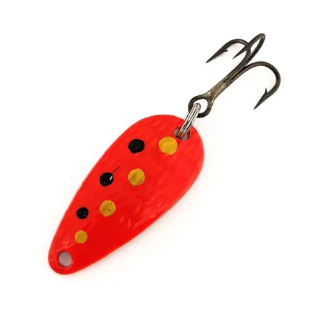 Vasaroitu pinta peittää tämän Thomas Cyclone UV -uistimen rungon, varmistaen että metalli heijastaa valoa joka kulmasta. Tässä 1 1/4" (3 cm) lusikkauistimessa, tuotekoodiltaan 11492, on fluoresoiva oranssi pohjaväri käsin lisätyillä keltaisilla ja mustilla pisterosteilla. UV-valossa viimeistely hohtaa selvästi, mikä on suunniteltu hämäriin olosuhteisiin tai syvempään veteen. Tämä 1/8 oz (4,3 g) lusikka on valmistettu USA:ssa ja siinä on alkuperäiset varusteet, mukaan lukien uistinrengas ja pronssattu kolmihaarakoukku. Yksilö on 5/5-kunnossa, ja sen viimeistely sekä metalliosat ovat puhtaat ja hyvin säilyneet.