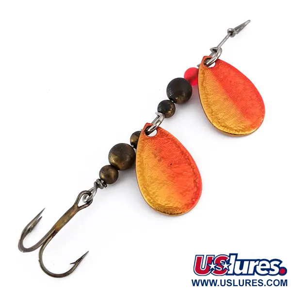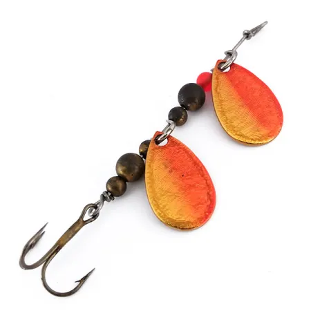 Tämä 7 cm (2 3/4") pituinen kaksilippainen houkutin edustaa klassista amerikkalaista Thomas hardware -käsityötaitoa. Molemmat pisaranmuotoiset lipat on viimeistelty Kulta / Punainen -liukuvärillä, jossa metallinhohtoinen kultapohja vaihtuu täyteläiseen oranssinpunaiseen sävyyn. Lippojen kääntöpuolelta löytyvät valmistajan aidot stanssaukset, jotka tunnistavat sen THOMAS DOUBLE SPINN -malliksi, ja painomerkinnät on lyöty syvälle metalliin. Runko koostuu erikokoisista tummista messinkihelmistä, joita täydentää yksi kirkkaanpunainen helmi lankaryungon yläosassa. Perään on kiinnitetty tumma kolmihaarakoukku, joka sopii tämän vintage-henkisen, USA:ssa valmistetun uistimen pelkistettyyn estetiikkaan. Arvosanalla 5/5 varustettu 5 g (3/16 oz) yksilö, tuotekoodiltaan 10133, on pinnoiltaan poikkeuksellisen siisti sekä maalattujen että stanssattujen osien osalta.
