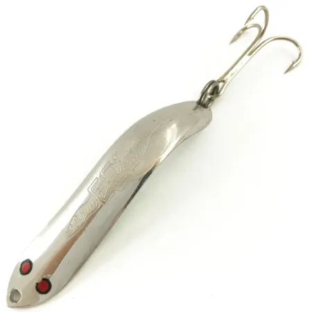 Kiillotettu nikkelipinta määrittelee tämän 6 cm pitkän vintage-lusikkauistimen rungon, jossa on kaksi erottuvaa punaista silmätäplää lähellä siimakiinnitystä. Etupuolelle on stanssattu ”EEL”-nimikyltti ja yksityiskohtainen kalakuvio, mikä on tyypillistä yhdysvaltalaisen Thomas Lures -valmistajan tuotannolle. Vaikka tuotekoodiksi on merkitty 5657 ja painoksi 10 g, metallin kääntöpuolella on tehtaan ”3/8 OZ” -leima sekä mallinumero R324 ja tuotemerkin logo. Varustukseen kuuluu vankka kolmihaarakoukku, joka on kiinnitetty uistinrenkaalla, eikä siinä ole käytön jälkiä. Tämä yksilö on erinomaisessa 5/5-kunnossa ja säilyttää peilimäisen kiillon kaarevalla pinnallaan. Viehe on tasapainotettu erilaisiin heitto- ja uistelusovelluksiin, joissa tarvitaan kapeaa profiilia.