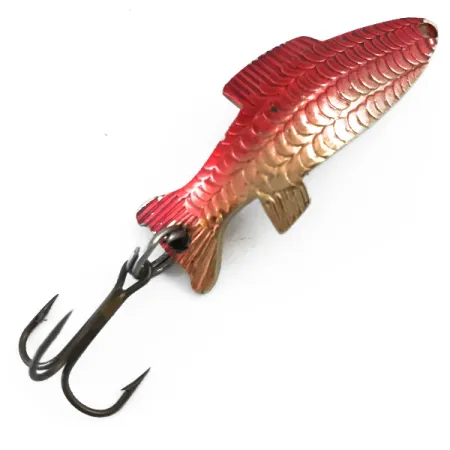 Kullan ja punaisen sävyt sulautuvat toisiinsa 4 cm pitkän rungon kohokuvioidussa suomupinnassa. Tässä Thomas Fighting Fish -uistimessa, tuotekoodi 5328, on erikoistunut kalanmuotoinen profiili, jossa on suoraan metalliin stanssatut selkä- ja rintaevät. 7 g paino tarjoaa tarvittavan tiheyden tarkkoihin heittoihin halutuille alueille. Kääntöpuolella kiillotettu kultapinta on selkeästi merkitty valmistajan nimellä, mallinimellä ja T109-tunnuksella. Pronssiviimeistelty kolmihaarakoukku on kiinnitetty perään uistinrenkaalla, mikä säilyttää tämän USA:ssa valmistetun vieheen klassisen kokoonpanon. Arvosanalla 5/5, yksilön kunto on erinomainen: pinta on kirkas ja stanssattu teksti täysin luettavissa.