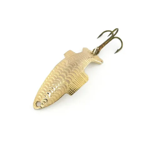 Pakotettu suomukuvio peittää tämän 4 cm (1 1/2") lusikan kuperan puolen tarjoten luonnollisen tekstuurin, joka tehostaa välkettä kelauksen aikana. Tämä 7 g (1/4 oz) painoinen kultainen Thomas Fighting fish, tuotekoodiltaan 8619, on klassinen esimerkki amerikkalaisesta uistinkäsityöstä. Kääntöpuoli on sileä ja siinä on syvä 'FIGHTING FISH' -leima, joka erottuu selvästi kiiltävästä kultapinnasta. Tämä uistin on 5/5-kunnossa, ja sen pinnoite sekä osat ovat säilyneet huomattavan kirkkaina ja toimivina. Muotoiluun kuuluu levenevä evärakenne lähellä pyrstöä, joka päättyy alkuperäiseen kolmihaarakoukkuun. Uistin on valmistettu Yhdysvalloissa, mikä heijastaa vanhalle Thomas-tavaralle tyypillistä kestävää valmistuslaatua.