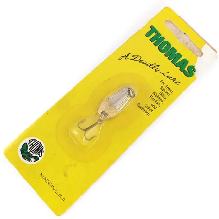 Tämä kompakti lusikkauistin, johon on lyöty "TIGER"-nimi suoraan kultapintaiseen metalliin, edustaa amerikkalaisen kalastusvälinesuunnittelun klassista aikakautta. Se painaa 1/8 unssia (3,2 g) ja on 1 tuuman (2,5 cm) pituinen, ja se on säilynyt alkuperäisessä kelta-vihreässä tehdaspakkauksessaan. Tässä Thomas Little Tiger -mallissa, tuotekoodi 9998, on kirkas kultaviimeistely, joka on suunniteltu heijastamaan valoa heitossa tai uistelussa. Pakkauskortissa mainitaan selkeästi sen alkuperä "MADE IN U.S.A." ja se on tarkoitettu monenlaisille riistakaloille ahvenkaloista loheen. Käyttämättömänä yksilönä (kunto: 6) uistin on säilyttänyt tehdasuuden ulkonäkönsä, mukaan lukien alkuperäinen tumma kolmihaarakoukku ja kirkas läpipainopakkaus. Vasemmassa alakulmassa oleva pyöreä vihreä logo antaa tuotemerkille sen klassisen visuaalisen ilmeen kirkkaan keltaista taustaa vasten.