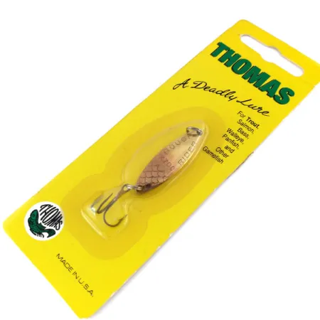 Kuparointi peittää tämän klassisen lusikkauistimen suomukuvioisen rungon, tarjoten voimakkaan välkkeen, joka on suunniteltu herättämään taimenen ja lohen huomio. Thomas Rough Rider painaa 1/4oz (7g), ja siinä on erottuva tekstuuroitu viimeistely, joka jäljittelee luonnollisen syöttikalan suomuja. Tämä tuotekoodilla 9997 tunnistettu yksilö on 3,7 cm (1 1/2") pitkä ja on edelleen alkuperäisessä keltataustaisessa tehdas包pakkauksessaan. Metallipinnan leima osoittaa selvästi mallinimen "ROUGH RIDER", mikä heijastaa amerikkalaisen valmistuksen laatua. Tämä uistin on käyttämätön ja kaupan alkuperäisessä kunnossa, saaden kuntoluokituksen 6. Pronssiviimeistelty kolmihaarakoukku on tukevasti kiinnitetty, ja se soveltuu heittokalastukseen virtavesissä tai uisteluun tunturijärvillä. Vintage-pakkaus mainitsee sen tehokkuuden kuha- ja ahvenkaloille, osoittaen monipuolisuuden, joka on pitänyt Thomas-uistimet kalastajien pakeissa vuosikymmenten ajan.