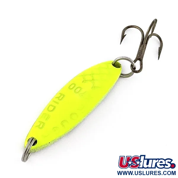 Metallipintaan meistetty 'RIDER X700' -teksti kertoo uistimen olevan Thomas-malliston perusvarusteita. Huomiovärillä eli fluorikeltaisella pinnoitettu 3,5 cm runko on suunniteltu erottumaan hyvin hämärässä tai sameassa vedessä heitettäessä. Kääntöpuolelta löytyy meistetty Thomas-logo ja 7 gramman (1/4oz) painomerkintä, mikä korostaa sen yhdysvaltalaista alkuperää ja vahvaa rakennetta. Vankka kolmihaarakoukku on kiinnitetty uistinrenkaalla, mikä heijastaa tämän 5/5-kuntoisen yksilön siistiä ja hyvin säilynyttä tilaa. Tuotekoodilla 23223 kulkeva uistin on profiililtaan kompakti, mikä mahdollistaa pitkät heittoetäisyydet.