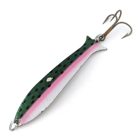 Tämän 6,5 cm pituisen puristetun metallirunkoisen uistimen viimeistelynä on tarkka Rainbow Trout -kuvio kiillotetun hopeapohjan päällä. Ensisijaisesti uisteluun suunniteltu Thomas Speedy Shiner (tuotekoodi 14383) painaa 5 g ja siinä on kapea, pikkukalaa jäljittelevä profiili. Etupuolen väritys koostuu tummanvihreästä selästä mustilla pilkuilla, selkeästä vaaleanpunaisesta kylkiviivasta ja valkoisesta vatsasta. Kääntöpuolella näkyvät valmistajan leimat ja hopeiseen metalliin selvästi kaiverrettu painomerkintä yhdessä kotkalogon kanssa. Tämä yksilö on erinomaisessa 5/5 kunnossa, ja sekä maalipinta että osat ovat säilyneet hyvin. Se on varustettu alkuperäisillä uistinrenkailla ja terävällä kolmihaarakoukulla, mikä vastaa USA:ssa valmistettujen, erityisesti lohikalojen pyyntiin tarkoitettujen Thomas-uistimien laatustandardeja.