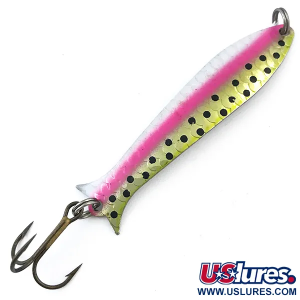 Tämä 6,5 cm (2 1/2") lusikkauistin on leimattu kääntöpuolelle klassisella logolla ja painomerkinnällä, ja siinä on Thomasin amerikkalaiselle valmistukselle ominainen kestävä nikkelipinnoite. Trout / Nickel -viimeistely on erityisen silmiinpistävä: siinä yhdistyvät rohkea neonpalanen kylkiviiva, kultavihreät suomukuvioinnit ja sarja syvänmustia täpliä. Painoltaan 5 g (3/16 oz) uistin on suunniteltu erityisesti vetouisteluun, ja sen hoikka, pitkänomainen profiili maksimoi näkyvyyden eri valaistusolosuhteissa. Tämä yksilö, tuotekoodiltaan 5040, on 5/5-kunnossa, ja maali sekä osat ovat säilyneet poikkeuksellisen hyvin. Se on varustettu kahdella vahvalla uistinrenkaalla ja terävällä kolmihaarakoukulla perässä, mikä korostaa laadukasta rakennetta, jota vintage-uistimelta odotetaan.