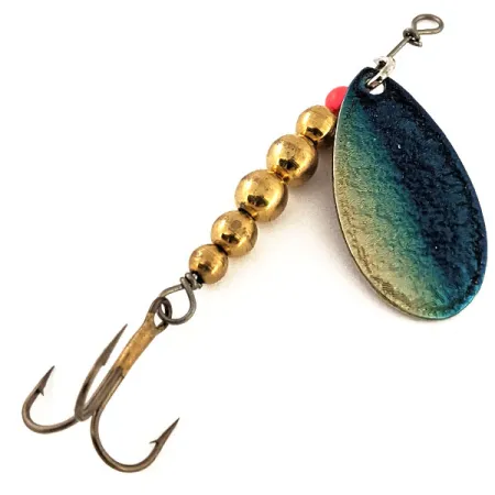 Kuvioidussa lavassa on liukuvärjäys syvänsinisestä hohtavaan kultaan, mikä luo hienon kontrastin kiillotetun nikkelinvärisen taustapuolen kanssa. Tämän 5 gramman (3/16 oz) yksilön alapuolelle on selkeästi meistetty valmistajan alkuperäiset merkinnät ja USA-alkuperä, mikä on laadun tae Thomas Spinn -mallille. Vieheen kokonaispituus on 7 cm (2 3/4"), ja sen runko koostuu viidestä eri kokoisesta kullanvärisestä helmestä sekä yhdestä pienestä punaisesta helmestä aivan lavan lenkin yläpuolella. Tämä tuotekoodilla 12816 tunnistettu yksilö on poikkeuksellisessa kunnossa (arvosana 5/5). Rakenne muodostuu perinteisestä lankarungosta ja terävästä kolmihaarakoukusta, vastaten hyväkuntoisen vintage-vieheen laatuodotuksia.