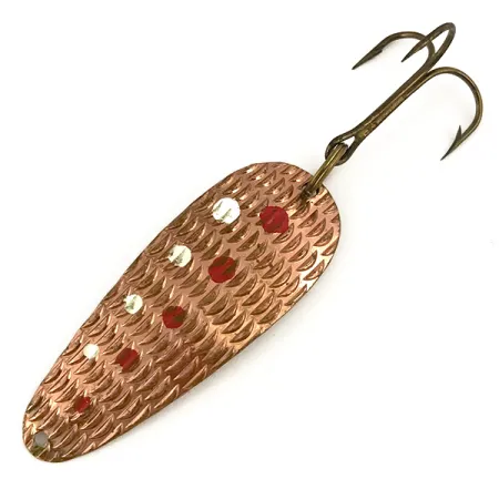 Tämä 5 cm (2") pituinen lusikkauistin on viimeistelty syvällä vasaroidulla kuparipinnalla, jota koristavat punaiset ja hopeanvalkoiset pisteet. Uistin painaa 10 g (1/3 oz), ja sen taustapuolelle on stanssattu teksti "THOMAS S516 1/3 OZ CYCLONE", joka kertoo valmistajan amerikkalaisista perinteistä. Tuotekoodilla 7342 listattu yksilö on 5/5-kunnossa, poikkeuksellisen puhdas ja hyvin pidetty. Uistinrenkaalla kiinnitetty pronssinen kolmihaarakoukku on terävä ja rakenteellisesti vankka. Siiman kiinnitysreikä on porattu tarkasti kapeaan päähän, täydentäen klassisen muotoilun.
