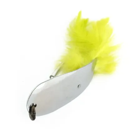 Nikkelöinti antaa peilimäisen viimeistelyn tälle yhdysvaltalaisvalmisteiselle lusikkauistimelle, jonka muotoilu on välttämätön valon heijastamiseksi eri vesiolosuhteissa. Painoltaan 12 g (2/5 oz) ja pituudeltaan 5,5 cm (2 1/4") oleva Tony Accetta HOBO, tuotekoodiltaan 13200, on vuosisadan puolivälin pakkiuistinten peruspilari. Uistimen koveraan puoleen on meistetty valmistajan leima ja "Genoa, O.", mikä kertoo sen alkuperästä Yhdysvalloissa. Rakenteeseen on integroitu yksihaukkukoukku, joka on koristeltu kirkkaankeltaisilla niskahöyhenillä (hackle), mitkä luovat selkeän kontrastin kiillotetulle metallille. Heittämistä helpottamaan kasvillisuuden seassa on koukun kärjen päälle sijoitettu ohut lankainen ruohosuojus. Yksilö on 5/5-kunnossa, säilyttäen kirkkaan loiston nikkelöidyillä pinnoillaan ja alkuperäisosissaan.
