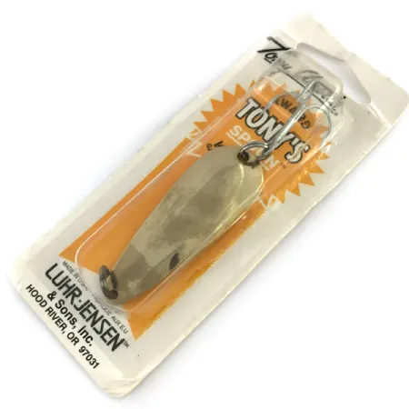 Tämä aitoon 24 karaatin kultaan upotettu, paksusta metallista valmistettu lusikkauistin on säilynyt alkuperäisessä Luhr-Jensen & Sons -pakkauksessaan Hood Riverin, Oregonin aikakaudelta. Viehe on käyttämätön ja sen kuntoluokitus on 6, mikä kertoo sen hyvin säilyneestä tilasta kirkkaassa myyntipakkauksessa. Tuotekoodilla 4933-005-0599 (9488) tunnistettu 11 g (2/5 oz) painava uistin on pituudeltaan 5,5 cm (2 1/4") ja sen takapuolen etiketissä on valmistuspäiväleima 22.06.99. Tony Accetta -lusikat tunnetaan selkeästä stansatusta muotoilustaan, jossa 24K kultaviimeistely maksimoi valon heijastuksen heitto- tai vetouistelussa. Varustukseen kuuluu vankka kolmihaarakoukku perässä ja valmiiksi porattu reikä kärjessä siiman turvallista kiinnittämistä varten. Tässä nimenomaisessa yksilössä on tallella alkuperäinen monikielinen luettelotarjous pakkauksen kääntöpuolella, mikä oli tyypillistä Luhr-Jensenin kansainväliselle jakelulle 1990-luvun lopulla.