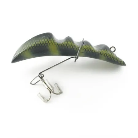 Tämän Bradson-uistimen aaltoilevaa runkoa peittää selkeä haukikuvio ja hieno hunajakennomainen suomukuviointi. Vieheen pituus on 9,5 cm (3 3/4") ja paino 12 g (2/5 oz). Sille antaa uniikin profiilin sarja sille ominaisia kyhmyjä. Tummat pystyraidat ja vihreänkeltaiset sävyt on painettu suomukuvioisen verkon päälle, mikä luo elävän ulkonäön erilaisiin olosuhteisiin. Varusteluun kuuluu vatsapuolelle kiinnitetty lankaviritelmä, joka asettaa yhden kolmihaarakoukun rungon alle keskellä olevan metallikiinnikkeen avulla. Tämä Vintage Bradson Wave fish (tuotekoodi: 23625) on poikkeuksellisen hyvin säilynyt, ja se on saanut kuntoluokituksen 5/5 puhtaiden pintojen ja ehjien osien ansiosta. Siiman kiinnityslenkki sijaitsee segmentoidun, harjanteisen rungon aivan etuosassa, mikä on tyypillistä 1900-luvun puolivälin amerikkalaisten uistimien luovalle suunnittelulle.