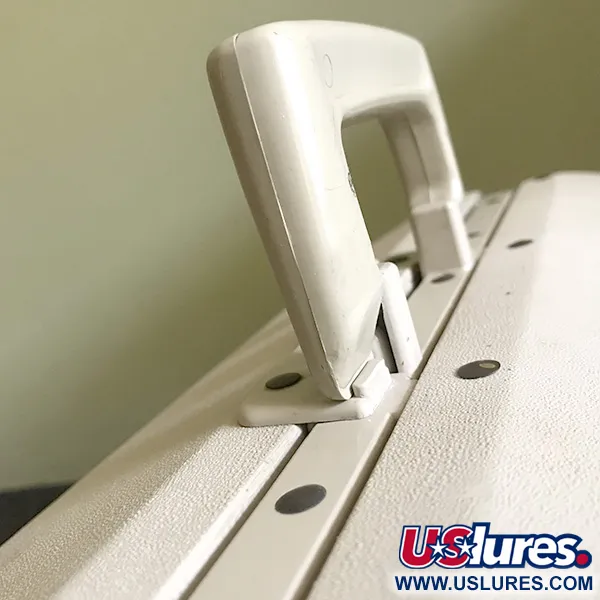Tämä 50 cm (19 3/4") pitkä klassinen kaksivärinen pakki edustaa sitä vankkaa kestävyyttä, josta Plano Molding Co. tunnettiin Illinoisin tuotantokaudellaan. Valkoinen yläkuori ja kontrastinen harmaa alaosa kätkevät sisäänsä monimutkaisen sisärakenteen, jossa on 6 porrastettua hyllyä. Avattuna niistä paljastuu 45 yksittäistä lokeroa uistimille ja tarvikkeille. Lukossa on alkuperäinen leima, jossa näkyy selvästi mallimerkintä 8600, "P"-logo sekä ikoninen hyppäävän kalan kuva. Tämä Yhdysvalloissa valmistettu yksilö (tuotekoodi 6574) on säilyttänyt rakenteellisen eheytensä, ja sen saranat sekä lukot ovat täysin toimivat. Pakki on suljettuna noin 28 cm (11") korkea ja 25 cm (9 7/8") leveä. Pinnassa on joitakin käytöstä tulleita naarmuja, mutta se on täysin ehjä ja halkeilematon. Tukeva valkoinen kahva ja metalliset lukitusosat toimivat moitteettomasti, vastaten kuntoluokitusta 4/5. Takasaranat ovat tiukasti kiinni, mikä varmistaa kannen pysymisen suorassa syvää pohjaosaa käytettäessä.