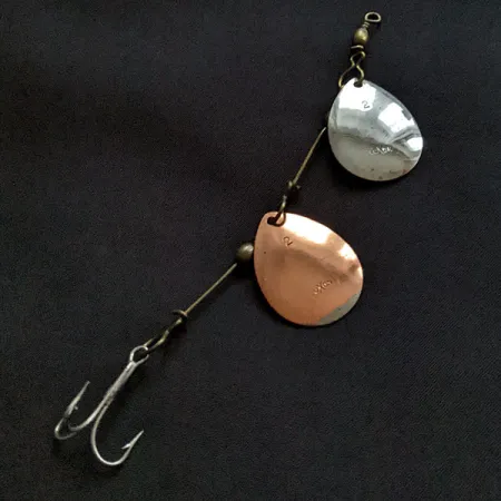 Nikkeli- ja kuparilehdet luovat ensisijaisen visuaalisen kontrastin tälle 1/4 unssin (7 g) yksilölle. Kaksi erilaista metalliviimeistelyä, joihin on stanssattu numero 2, tekevät Vintage Luxon 2 Double Spinneristä erityisen; siinä käytetään tandem-asennossa olevia pisaranmuotoisia lehtiä jäykässä messinginvärisessä lankarungossa. Tämä 10 cm (4 tuumaa) pitkä amerikkalaisvalmisteinen harvinaisuus edustaa LUXONin tunnettua toiminnallista muotoilua, jossa lankarungon kestävyys on keskiössä. Kokonaisuus on viimeistelty messinkihelmillä ja tarkasti taivutetuilla silmukoilla, jotka kiinnittävät osat varmasti ilman ylimääräistä painoa. Tuotekoodilla 22217 tunnistettu viehe on säilynyt erinomaisessa kunnossa, ja sen metallipinnat loistavat alkuperäisessä kiillossaan, vastaten kuntoluokitusta 5/5. Kolmihaarakoukku on kiinnitetty tavallisella lenkillä, jolloin alkuperäiset hopeansävyiset osat säilyvät uistimen keskeisenä osana.