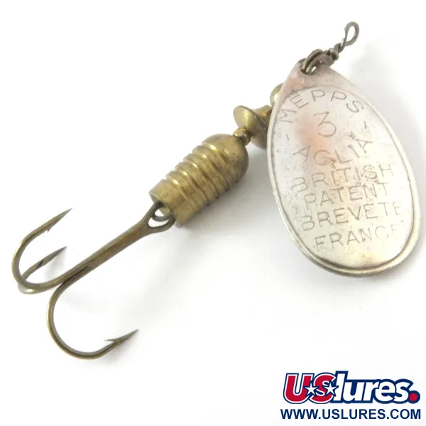 Lipan taakse on selvästi lyöty teksti "MADE IN FRANCE". Tämä koon 3 Mepps Aglia on perinteinen 1950-luvun yksilö, joka painaa 1/4 oz (7 g). Hopeaviimeistellyssä lipassa on syvät leimat "MEPPS 3 AGLIA" ja "BRITISH PATENT BREVETE", mikä osoittaa sen varhaisen patenttitilan. Uistimen kokonaispituus on 2 3/4" (7 cm), ja se on rakennettu raskaan messinkirungon ympärille, joka koostuu uritetusta kellosta ja pienestä ylähelmestä. Nämä Ranskassa valmistetut osat on koottu USA:ssa, kuten tuotekoodin 3944 historialliset tiedot osoittavat. Varustukseen kuuluu yksi kolmihaarakoukku, joka on kiinnitetty runkolankaan. Lanka päättyy käsin kierrettyyn lenkkiin siiman kiinnittämistä varten. Kuntoarvio on 5/5: metallipinnat ovat puhtaat ja leimat ovat säilyneet tarkkoina ja luettavina. Leveäprofiilinen lippa on kiinnitetty messinkisellä pantaosalla, mikä takaa vapaan pyörimisen keskiakselin ympäri.