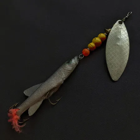 Tämän hybridilippauistimen kokonaispituus on 10 cm (4 tuumaa), ja se edustaa Mepps-käsityötaidon merkittävää aikakautta, jolloin ranskalaiset komponentit yhdistettiin amerikkalaiseen kokoonpanoon. Hopeisessa, koon 3 pajunlehtilipassa on meistetty vinoneliökuviointi etupuolella ja selkeä "Made in France" -merkintä kääntöpuolella. Lipan sankalenkin takana oleva viiden helmen sarja – yksi oranssi ja neljä keltaista – toimii visuaalisena siirtymänä pehmeään Mino-jigipyrstöön. Tämä 14 g (1/2 oz) painava yksilö, tuotekoodiltaan 21023, on varustettu kolmihaarakoukulla, joka tulee esiin realistisesta hopeanvärisestä syöttikalavartalosta, ja sen pyrstössä on hienovaraiset punaiset kuidut. Uistin on kuntoluokassa 4/5; pehmytmuoviosa on säilynyt erittäin notkeana ja metalliosat ovat edelleen kirkkaat. Ensisijaisesti heittokalastukseen tai uisteluun suunniteltu paino mahdollistaa tavoitesyvyyksien saavuttamisen, ja kuvioitu lippa tarjoaa tasaisen visuaalisen profiilin.