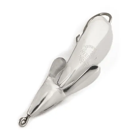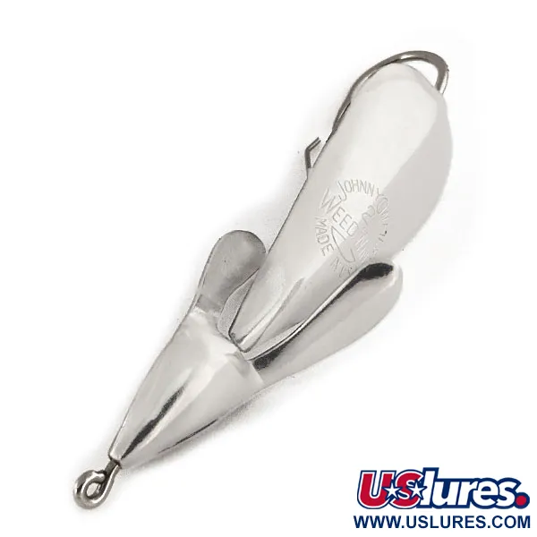 Nikkelipinnoite antaa upean kiillon tälle 6 cm (2 1/4") vintage-lusikalle, johon on selvästi leimattu Johnnie O’Neil Weed Wing -nimi ja alkuperämaa USA. Tuotekoodilla 12154 varustetussa 12 g (2/5 oz) vieheessä on tunnusomainen siipimäinen runko, jonka Johnnie O’Neil loi Akronissa, Ohiossa jo vuonna 1957. Kiinteä yksihaarakoukku on varustettu metallisella ruohosuojalla, joka on tarkoitettu kalastukseen tiheän kasvuston seassa, missä tavalliset vieheet jäisivät kiinni. Kunto on 5/5, ja metallipinta on säilynyt erittäin puhtaana ilman merkittävää kulumista. Tämä malli on valmistettu ennen yrityksen myyntiä Harrison Industriesille 1960-luvun puolivälissä, ollen aito Ohiossa tehty alkuperäistuote ajalta pian O'Neilin vuonna 1962 saaman patentin jälkeen.